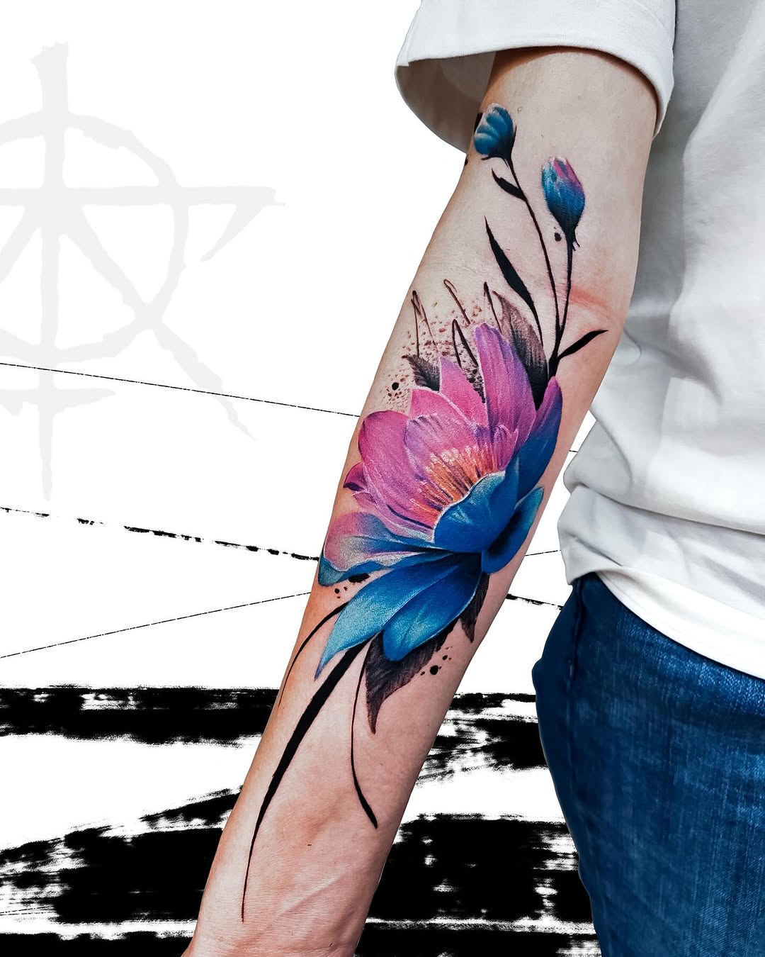 Ziotewicz, the Black Graphic Tattoo Artist - he graduated from the Faculty of Fine Arts in Toruń. He particularly enjoys creating large, splattered compositions, full of vibrant lines and distinctive "grime." He loves to replicate ink splatters, drips, and brush textures on the skin. He typically works with dark themes, but no subject intimidates him.