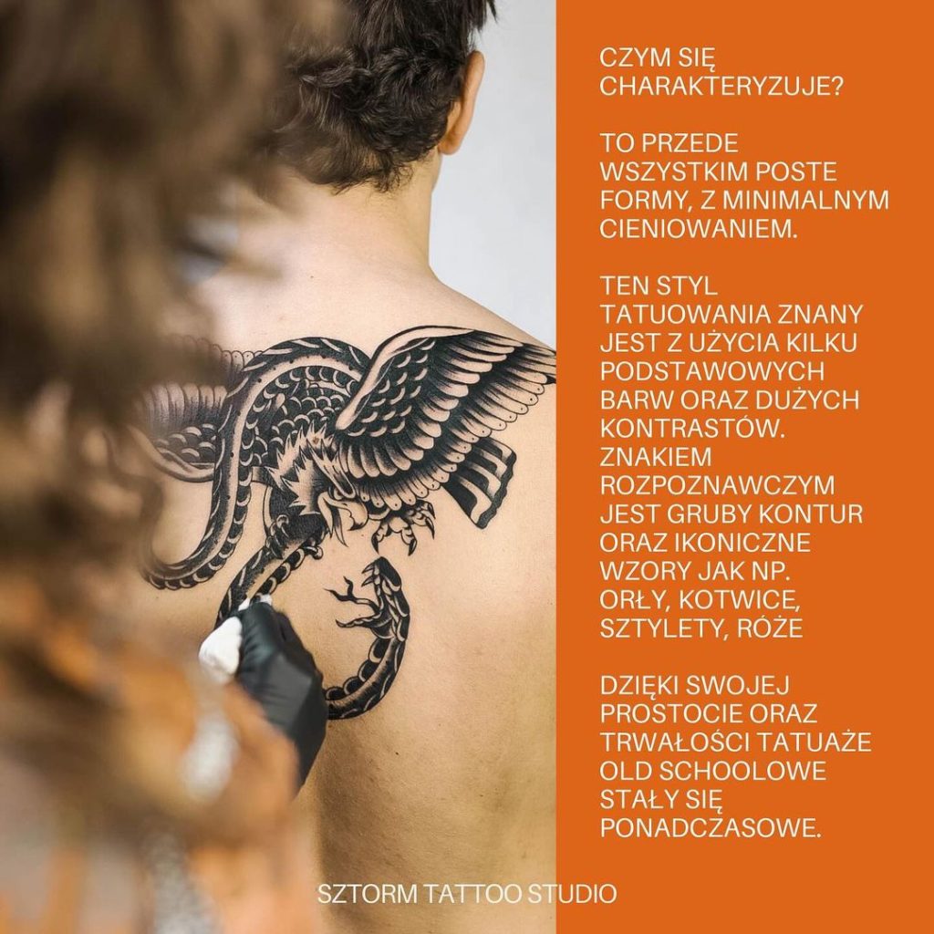 Portowe uliczki, awanturnicze tawerny, barber shopy to miejsca, gdzie narodził się old schoolowy styl. Charakteryzuje go przede wszystkim prostota form, minimalne cieniowanie, oraz użycie kilku podstawowych barw i dużych kontrastów. To także grube kontury i ikoniczne wzory, takie jak orły, kotwice, sztylety czy róże, które zdobią ciała na pamiątkę przygód czy podkreślając odwagę i pewnośc siebie. Te cechy sprawiają, że tatuaże old schoolowe są nie tylko ponadczasowe, ale także wyraziste i łatwe do rozpoznania.