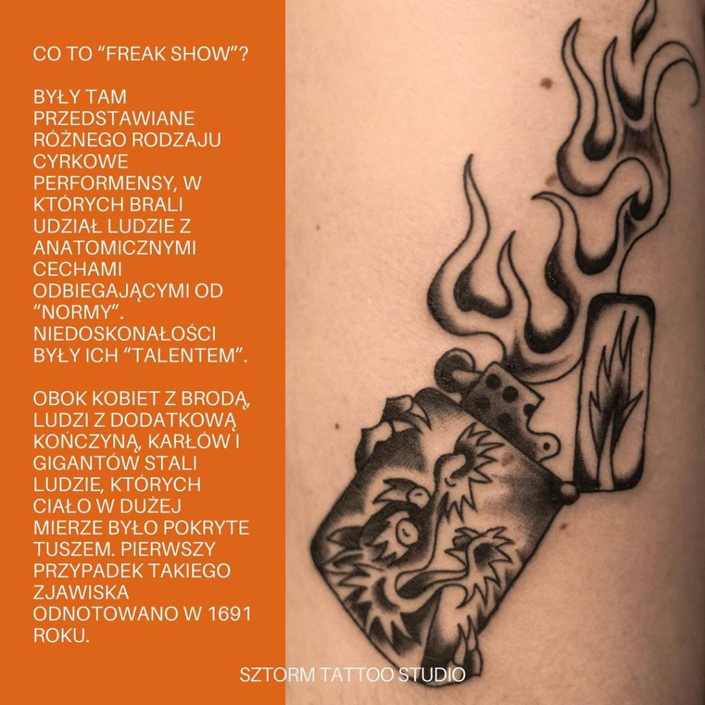 W freak showach prezentowano różnorodne cyrkowe występy, w których udział brali ludzie z nietypowymi cechami anatomicznymi. Oprócz osób z brodą, gigantów czy karłów, na scenie pojawiali się także ludzie z ciałami pokrytymi tatuażami. To właśnie tam można było zobaczyć pierwotne old schoolowe wzory, które dziś są klasyką.