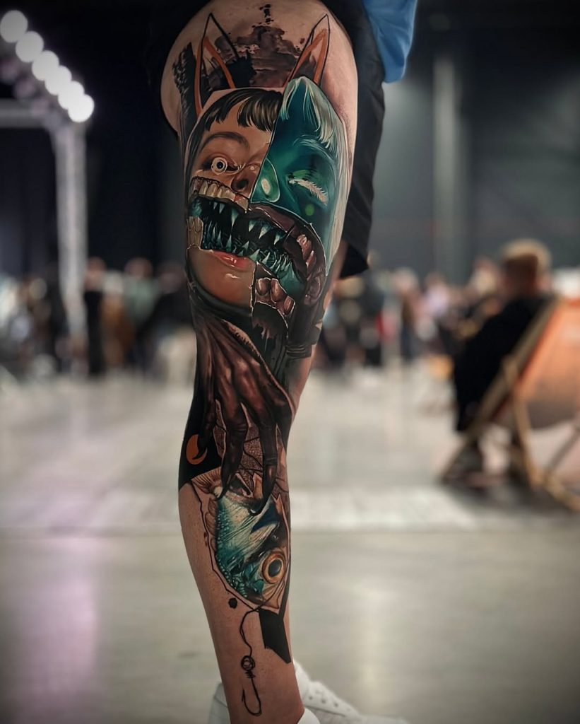 Nasz artysta Adam Ziotewicz w duecie z Aleną stworzyli podczas konwentu imponujący projekt, który został doceniony przez jury. Ich wspólna, dwudniowa praca zdobyła I miejsce w kategorii „Kooperacje”. Tatuaż był nie tylko precyzyjnie wykonany, ale też świetnie zaprojektowany, łącząc abstrakcyjne formy i realistyczne detale w spójną, artystyczną kompozycję. Co ciekawe, był to pierwszy tatuaż w życiu modela, który wykazał się ogromną odwagą i wytrwałością.