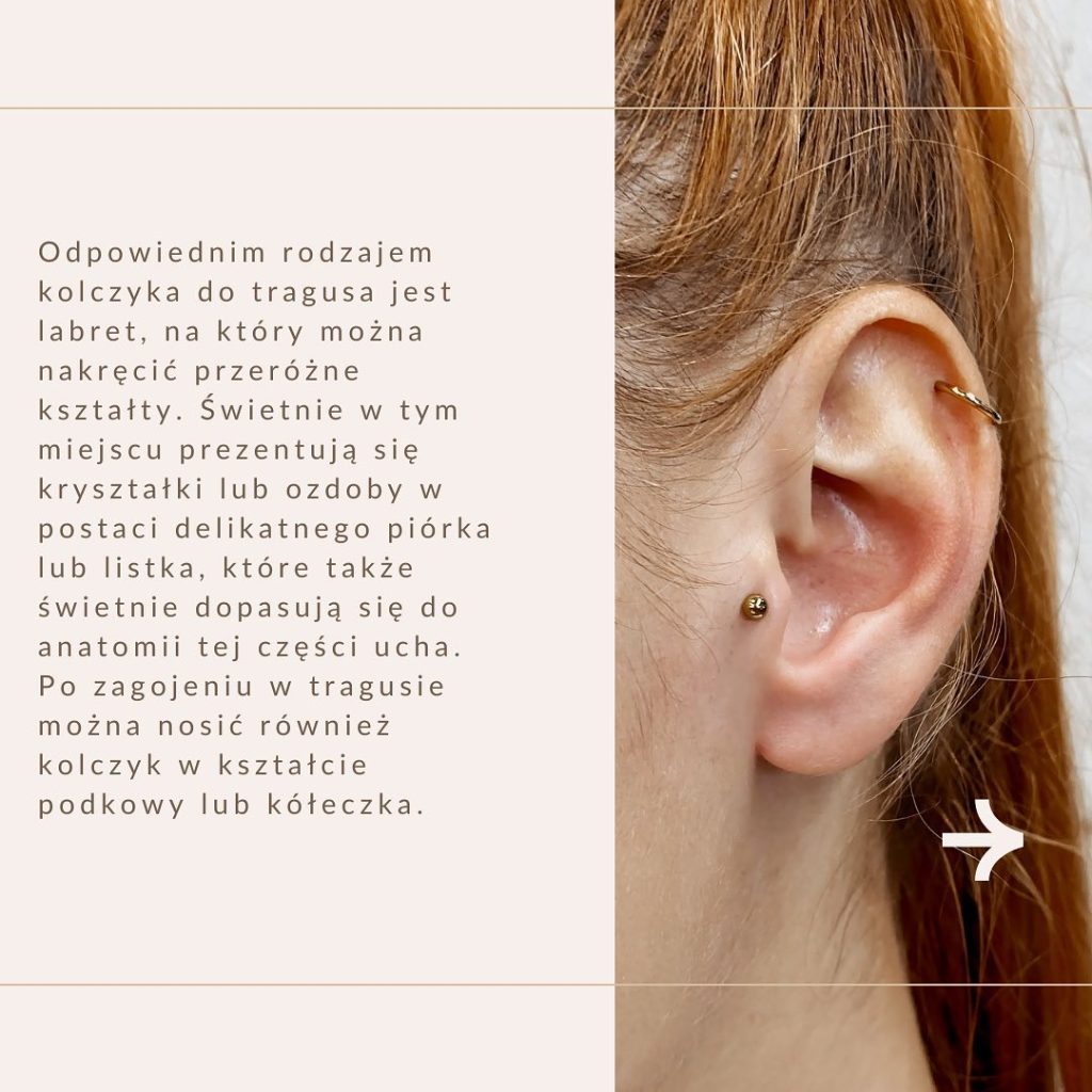 ✨ Odpowiednim rodzajem kolczyka do tragusa jest labret, na który można nakręcić przeróżne kształty. Świetnie w tym miejscu prezentują się kryształki lub ozdoby w postaci delikatnego piórka lub listka, które świetnie dopasują się do anatomii tej części ucha.