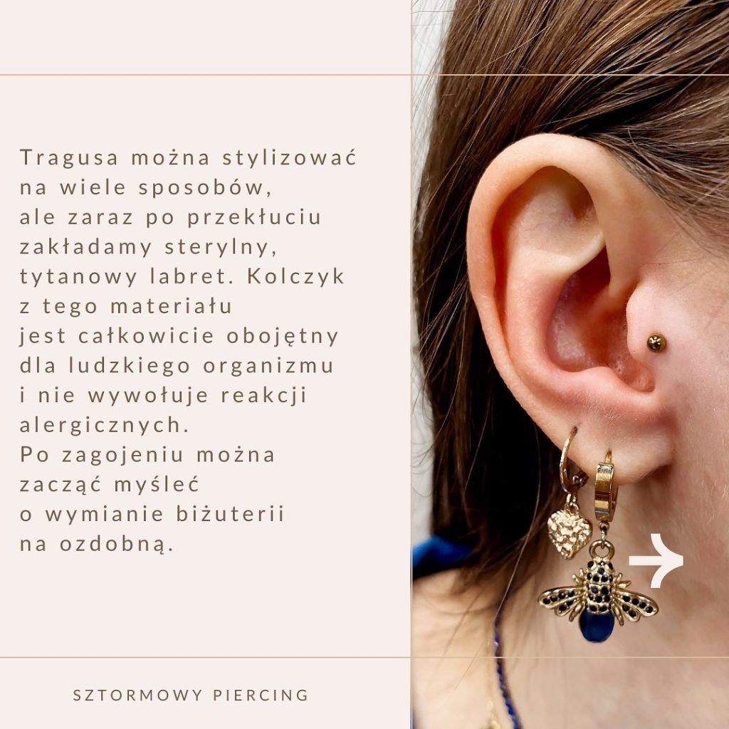 ✨ Tragus piercing można stylizować na wiele sposobów, ale zaraz po przekłuciu zakładamy sterylny, tytanowy labret. Kolczyk z tego materiału jest całkowicie obojętny dla ludzkiego organizmu i nie wywołuje reakcji alergicznych. Po zagojeniu można zacząć myśleć o wymianie biżuterii na ozdobną.