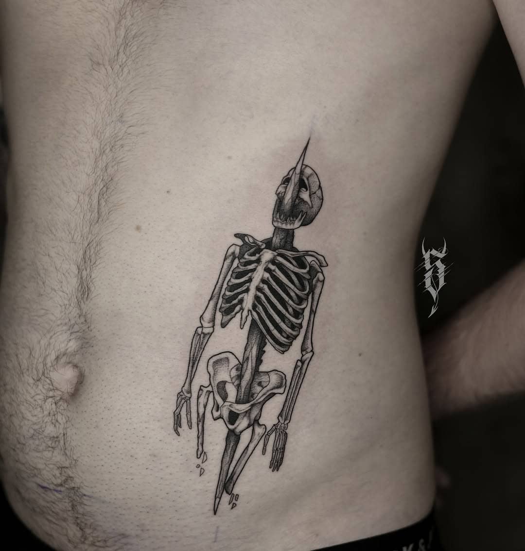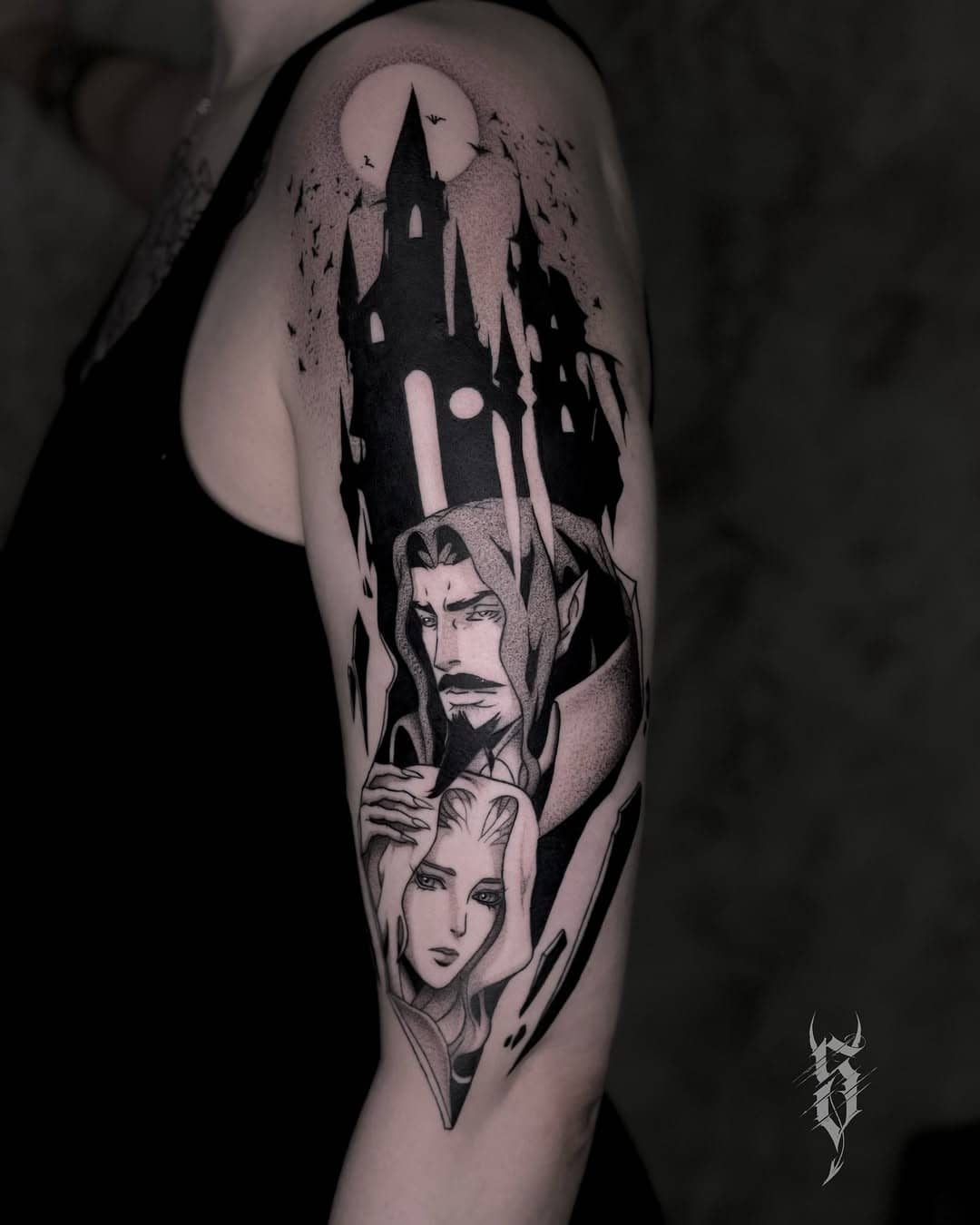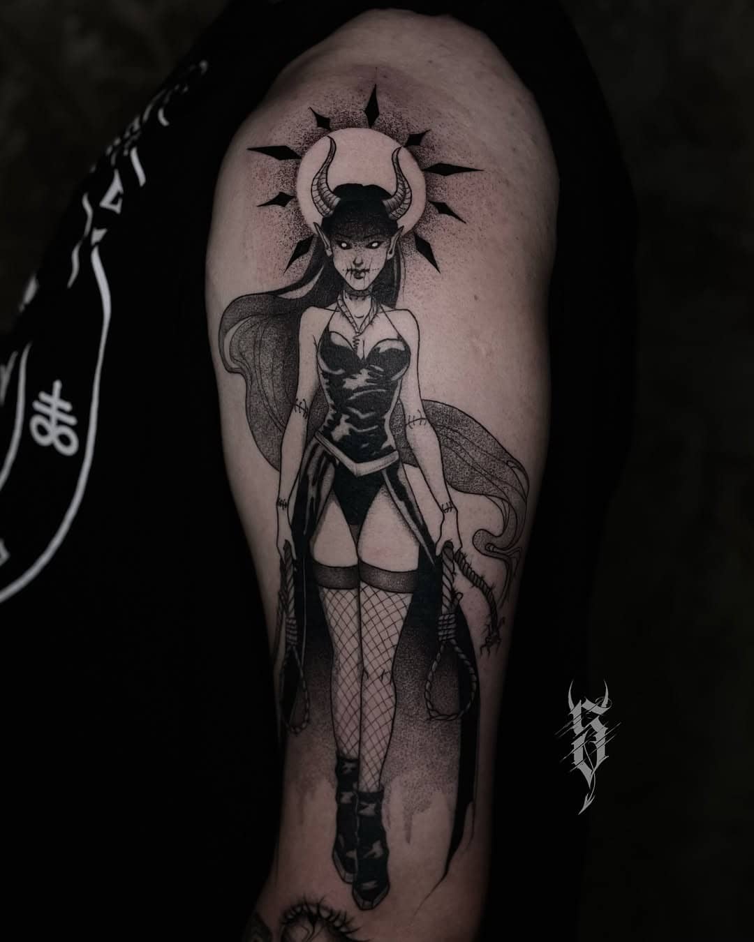 U Aliny znajdziecie przede wszystkim czerń i mocny kontrast. Wyraziste linie, płaskie wypełnienia, uproszczona forma. To tatuaż bez kompromisów, bez ozdobników. Jeśli pojawia się kolor, to tylko jako akcent – nigdy dla samego efektu. Tematyka? Trash, anime, magic, sex & violence. Ale też okultyzm, mitologia, fantasy. To jest świat, w którym czuje się najlepiej.