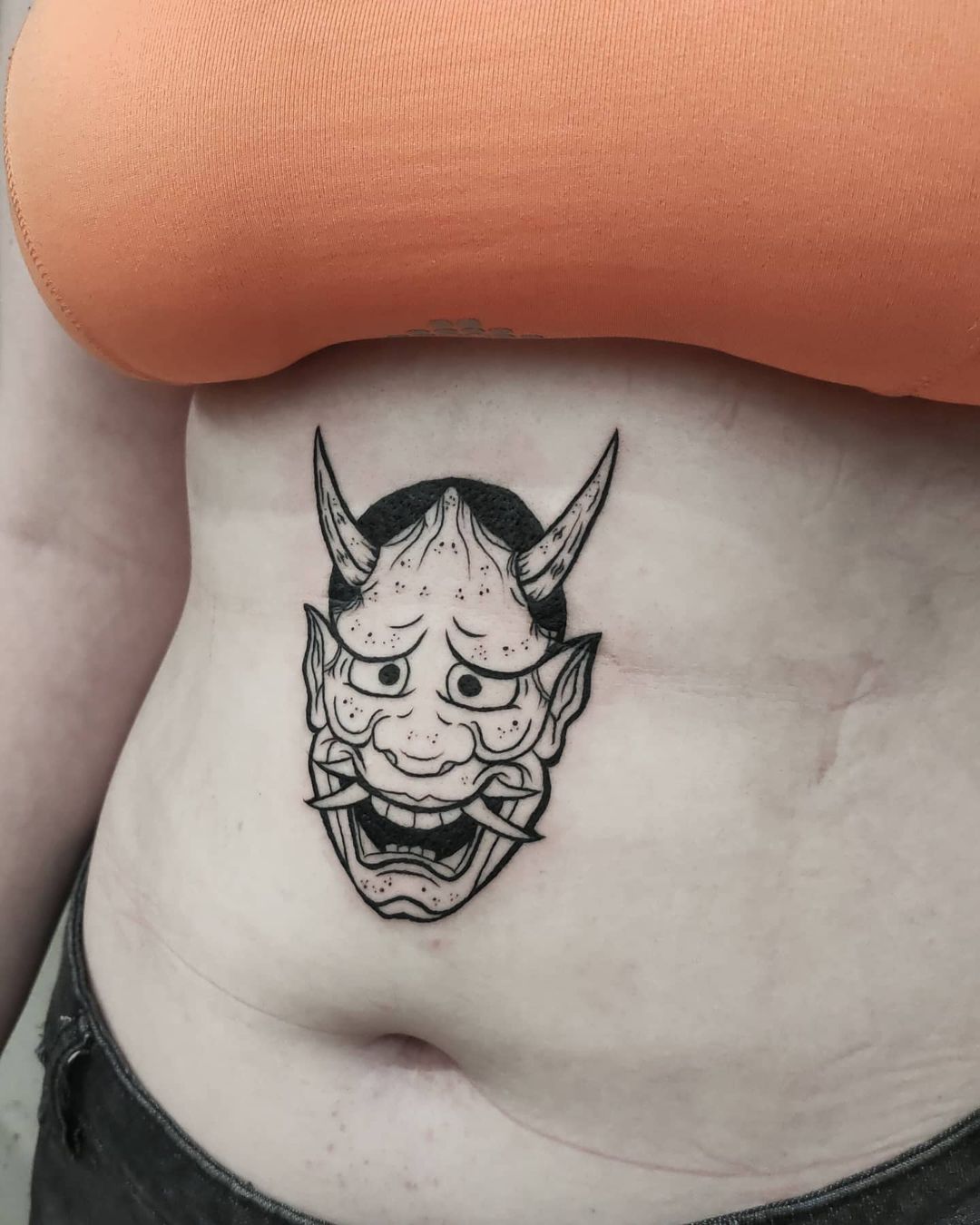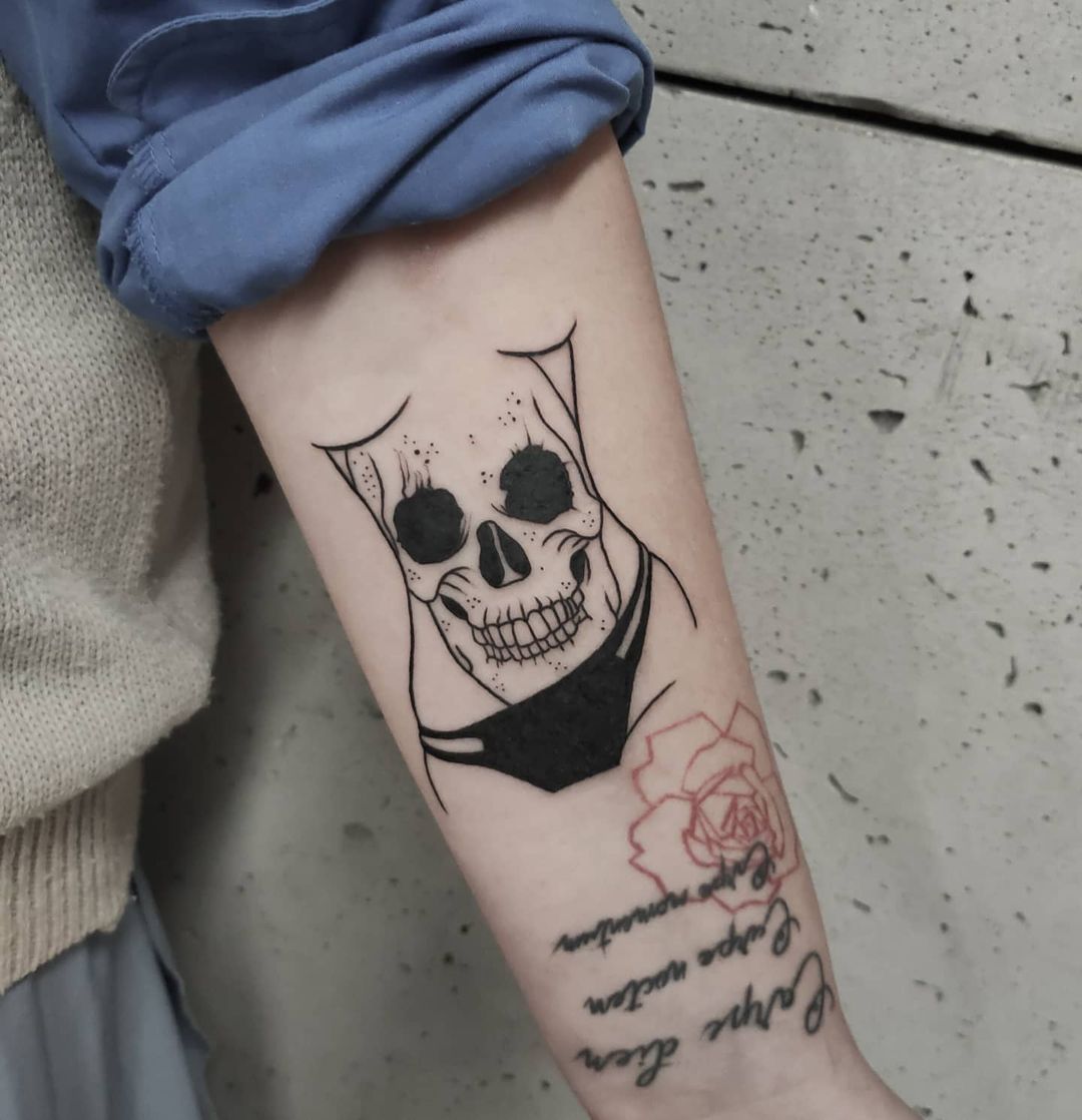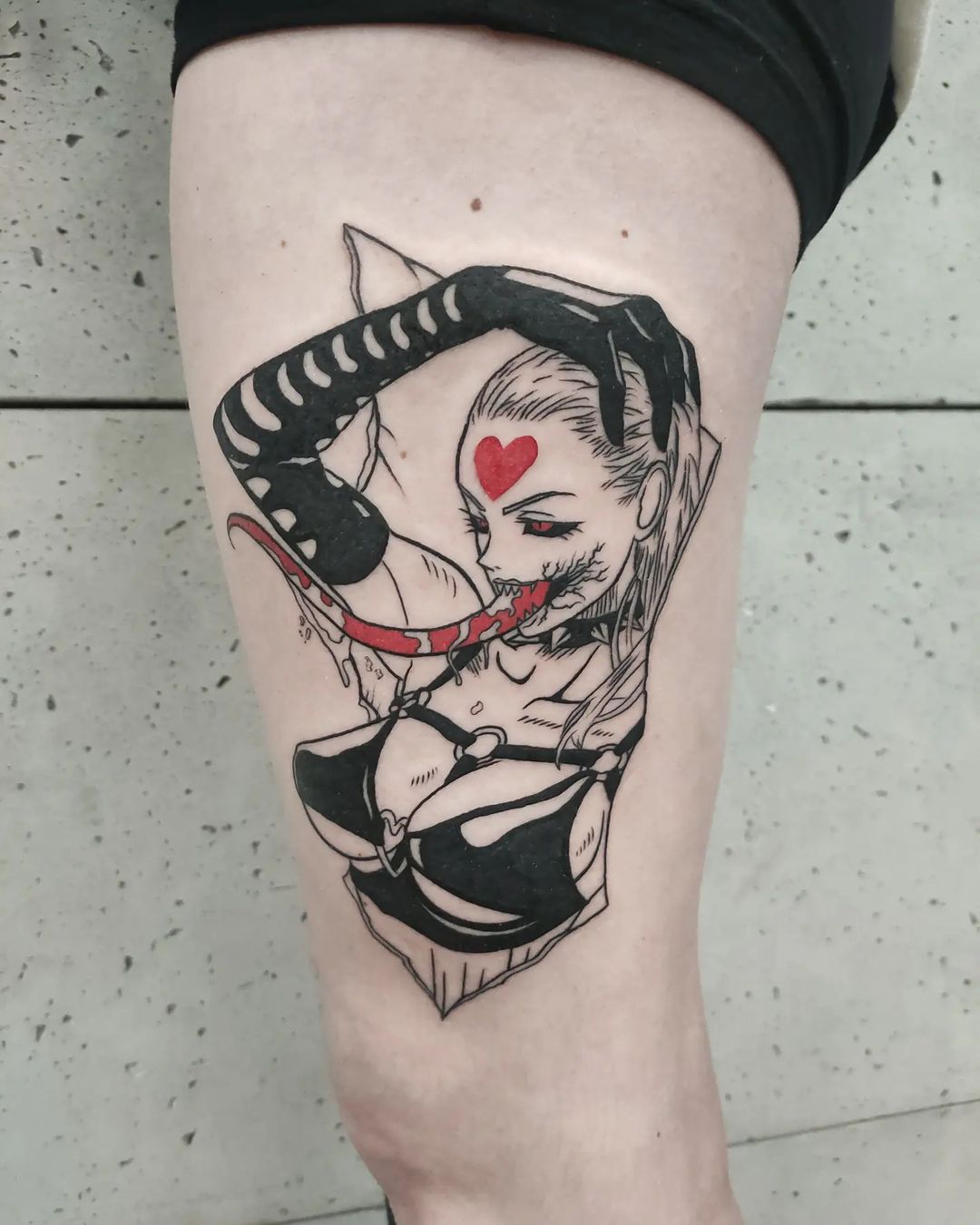 U Aliny znajdziecie przede wszystkim czerń i mocny kontrast. Wyraziste linie, płaskie wypełnienia, uproszczona forma. To tatuaż bez kompromisów, bez ozdobników. Jeśli pojawia się kolor, to tylko jako akcent – nigdy dla samego efektu. Tematyka? Trash, anime, magic, sex & violence. Ale też okultyzm, mitologia, fantasy. To jest świat, w którym czuje się najlepiej.
