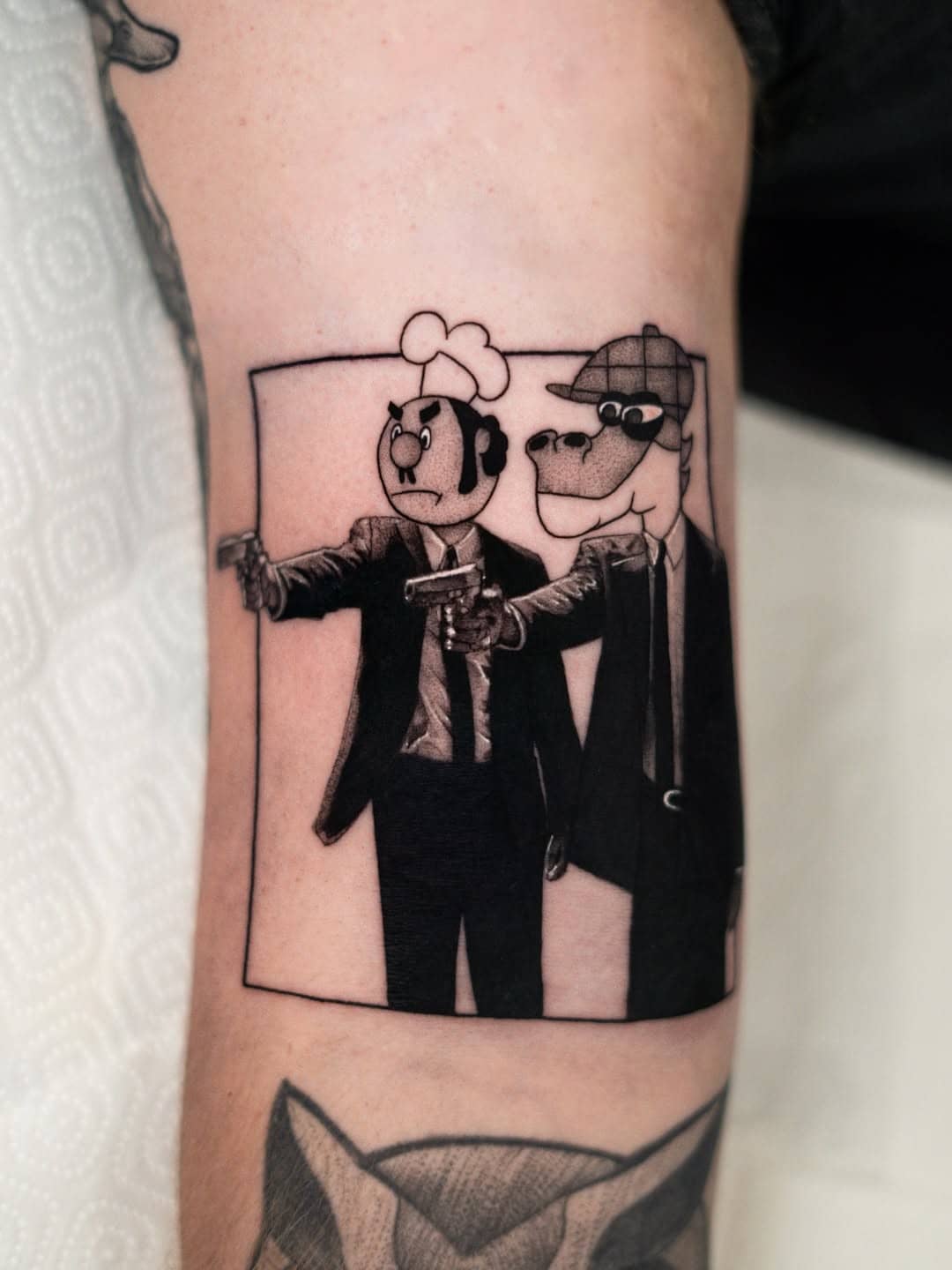 Drugim kierunkiem Navy jest surrealizm. To tatuaże, które nie trzymają się żadnych ram. Kobieta z głową grzyba, psy układające się w serce, anioły, dziwne postacie, mocne kontrasty. Trochę jak sen, trochę jak wizja.