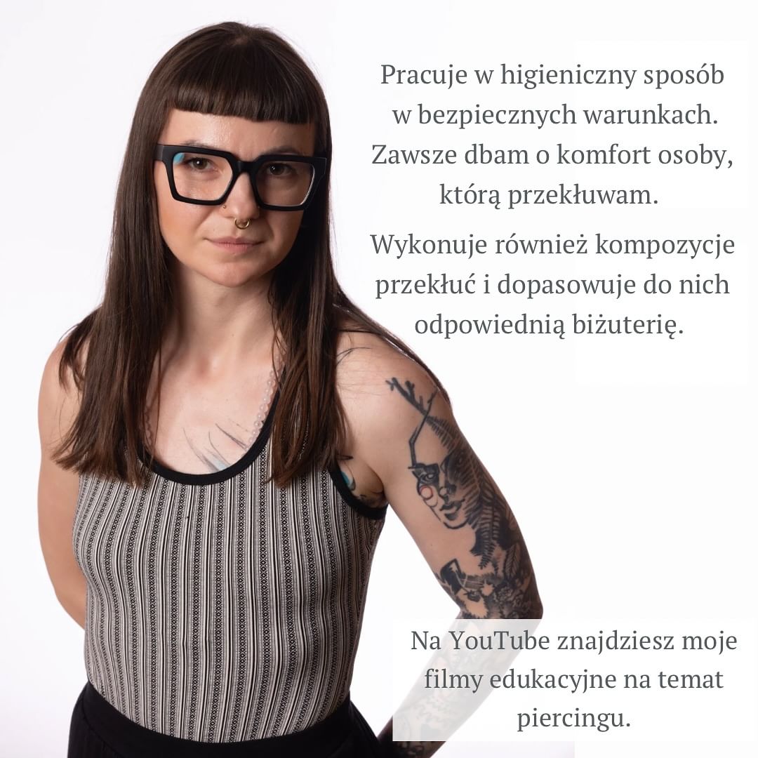 Beti zajmuje się różnego rodzaju przekłuciami od 2011 roku. Swoje pierwsze przekłucie zrobiła na sobie, ale już wtedy wiedziała, że sprzęt trzeba wysterylizować! Niedługo po tym ukończyła pierwszy (i nie ostatni!) kurs piercingu, i zaczęła się nim zajmować bardziej profesjonalnie. W swojej pracy bardzo dużą wagę przywiązuje do waszego bezpieczeństwa podczas przekłuć, sterylności oraz jakości świadczonych usług. Zawsze wytłumaczy Wam z anielską cierpliwością wszystkie kwestie - od tych najbardziej podstawowych po zawiłe i skomplikowane.
